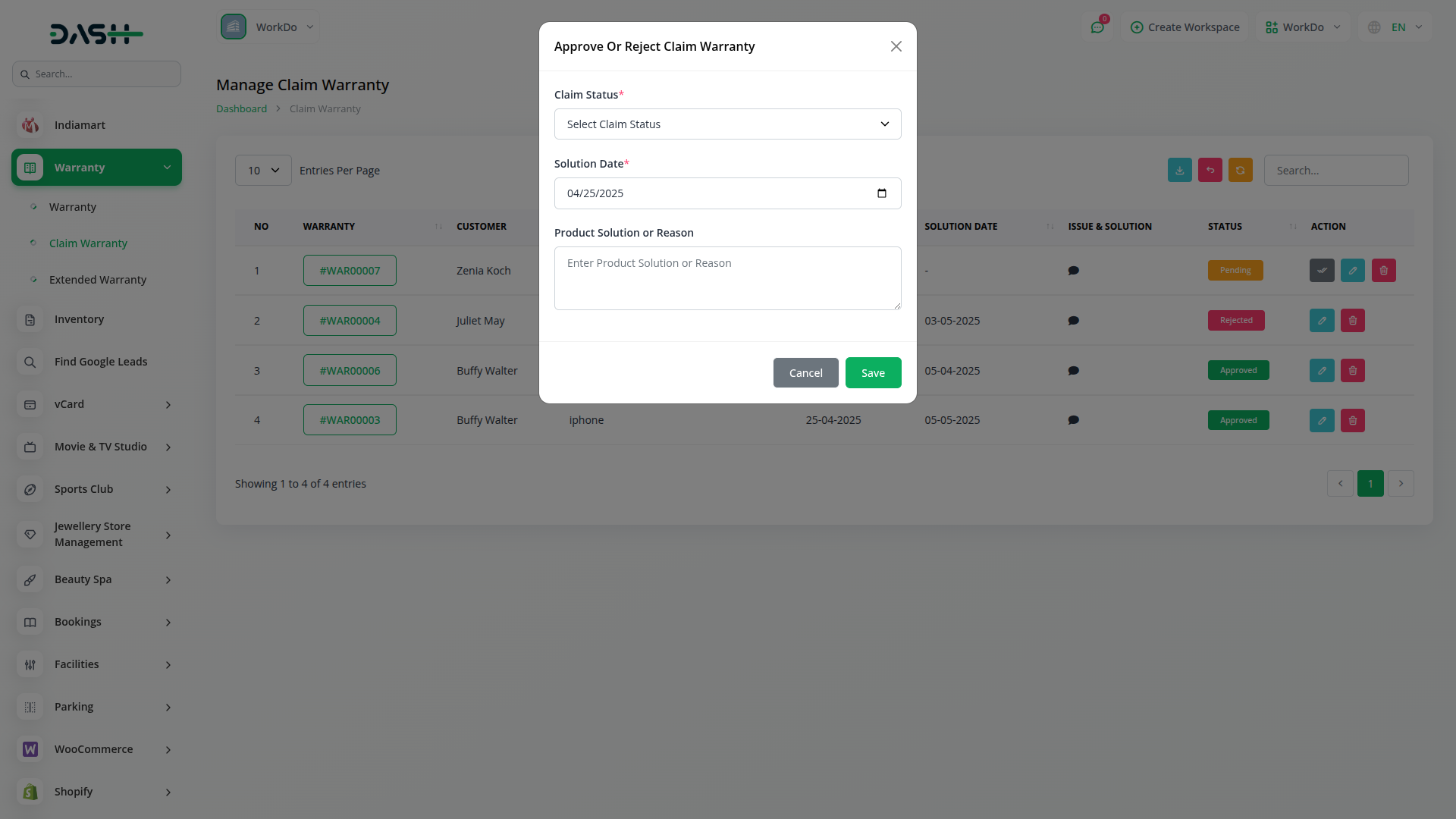 Admins can review, approve, or reject warranty claims. Each action can include reasons, solutions, and timestamps for complete transparency and accountability.